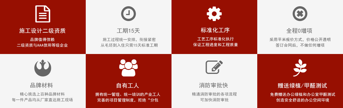項目均實行直營,無外包風險,依托自有設計、施工、項目管控、售后服務體系,一站式裝修服務